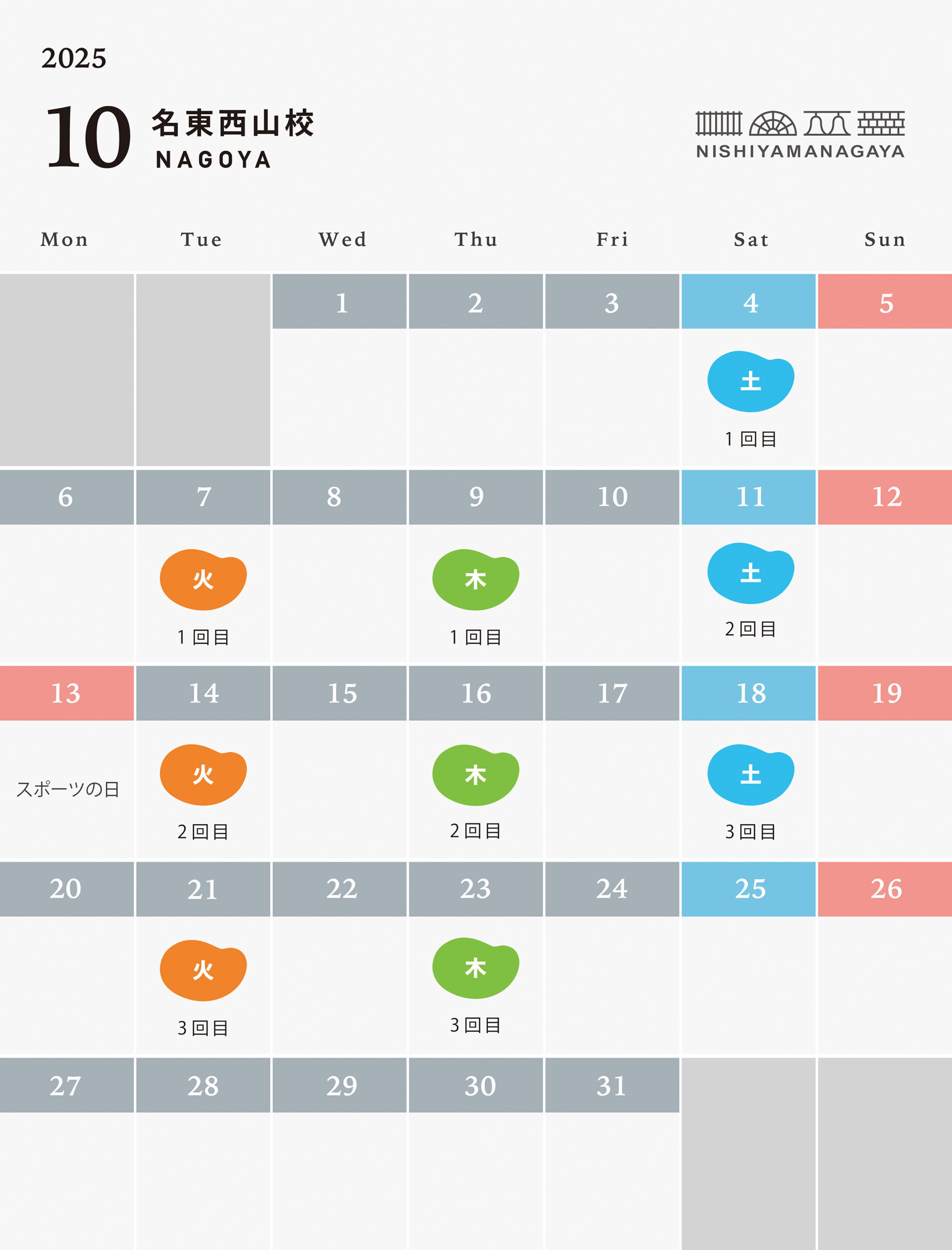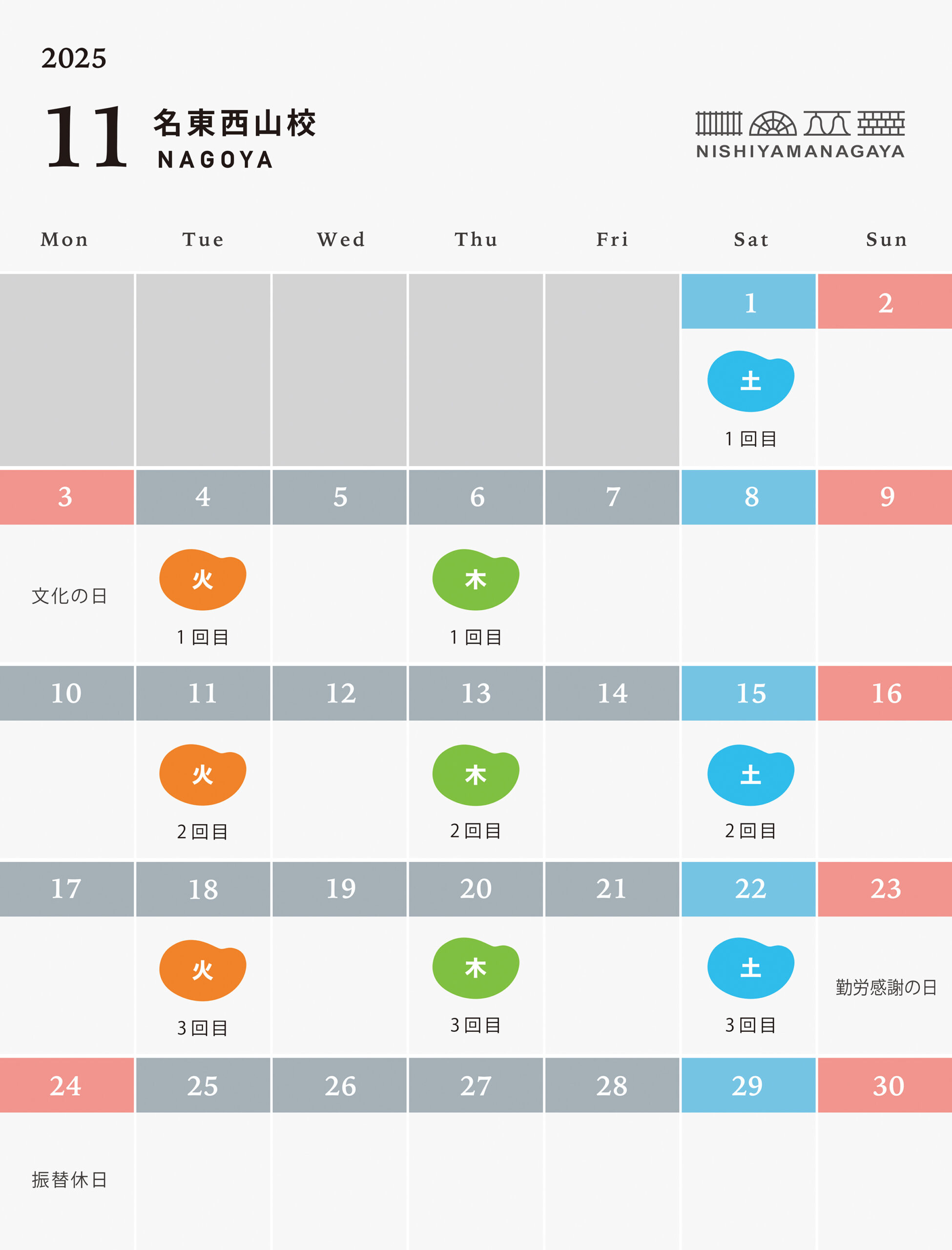 また、月に1回のみ開催日程の中からお休みの授業分を振替えて受講できるようにしています。ただし振替の授業の場合は、他の生徒と違う課題になる可能性もありますのでご了承ください。またなるべく指定した授業日にご参加していただけるようよろしくお願い致します。